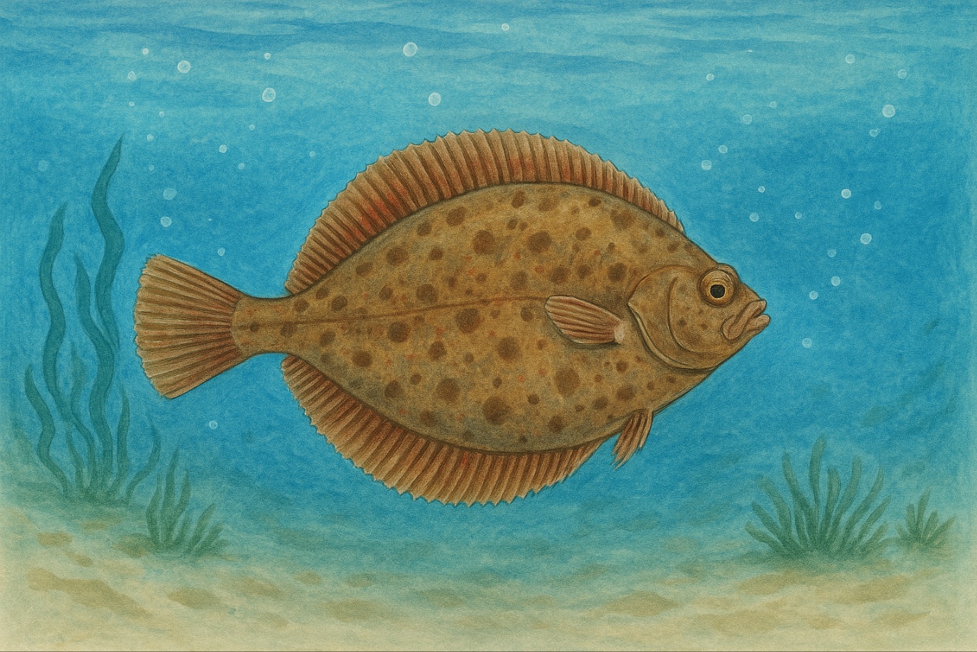 - 눈 위치: 보통 양쪽 눈이 한쪽(대부분 오른쪽)으로 몰려 있습니다.